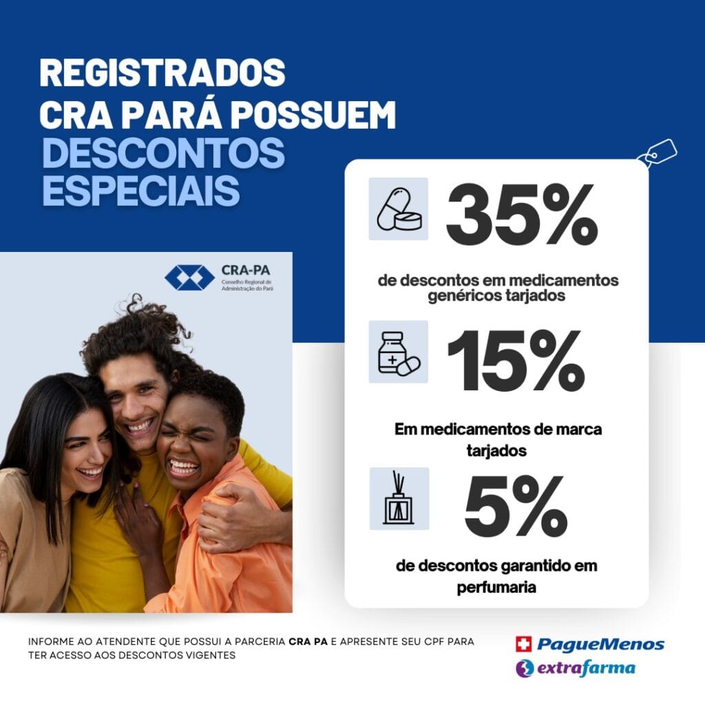 Visando ampliar ainda mais os benefícios para quem é registrado, o CRA-PA firmou um novo convênio, desta vez com a rede de Farmácias Extrafarma e Pague Menos. A parceria já está ativa e garante descontos que variam de 15% a 35% na compra de medicamentos, e de 5% em perfumaria.